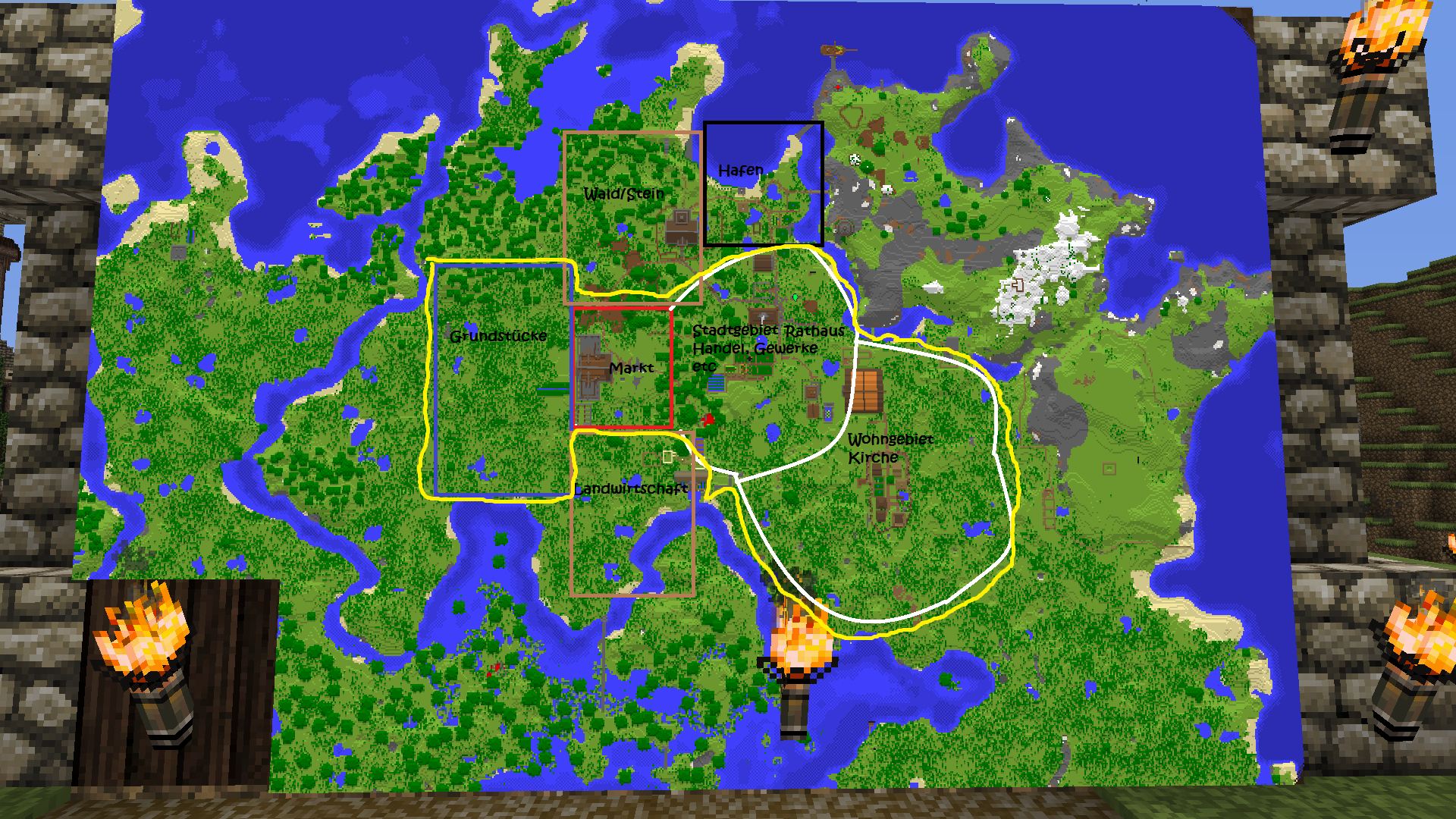 Ich hab das nur mal eben hingeklatscht, muss nicht genauso stehen bleiben und ist noch ausbaufähig...., aber so stell ich mir das ganze ungefähr vor. Ich möchte echt keine Rechteckstadt. Minecraft ist zwar quadratisch, umso mehr muss man meiner Meinung nach die Linearität gestalterisch aufbrechen.